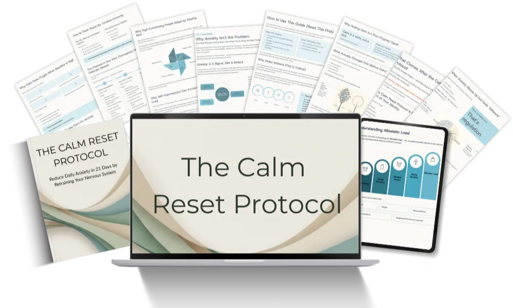 The Calm Reset Protocol (120-Page PDF Guide): A comprehensive, practical guide that walks you step by step through a body-first nervous system reset - explaining why anxiety feels physical, why it keeps coming back, and how to retrain your stress response using a clear, structured protocol.